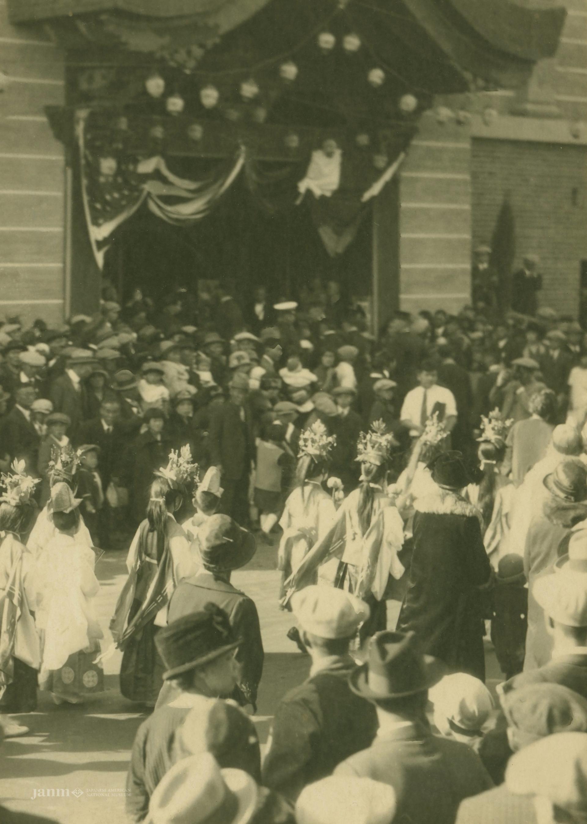Japanese children wearing Shinto regalia in parade at Nishi Hongwanji Temple, which was built in 1925 and is now known as JANM’s Historic Building